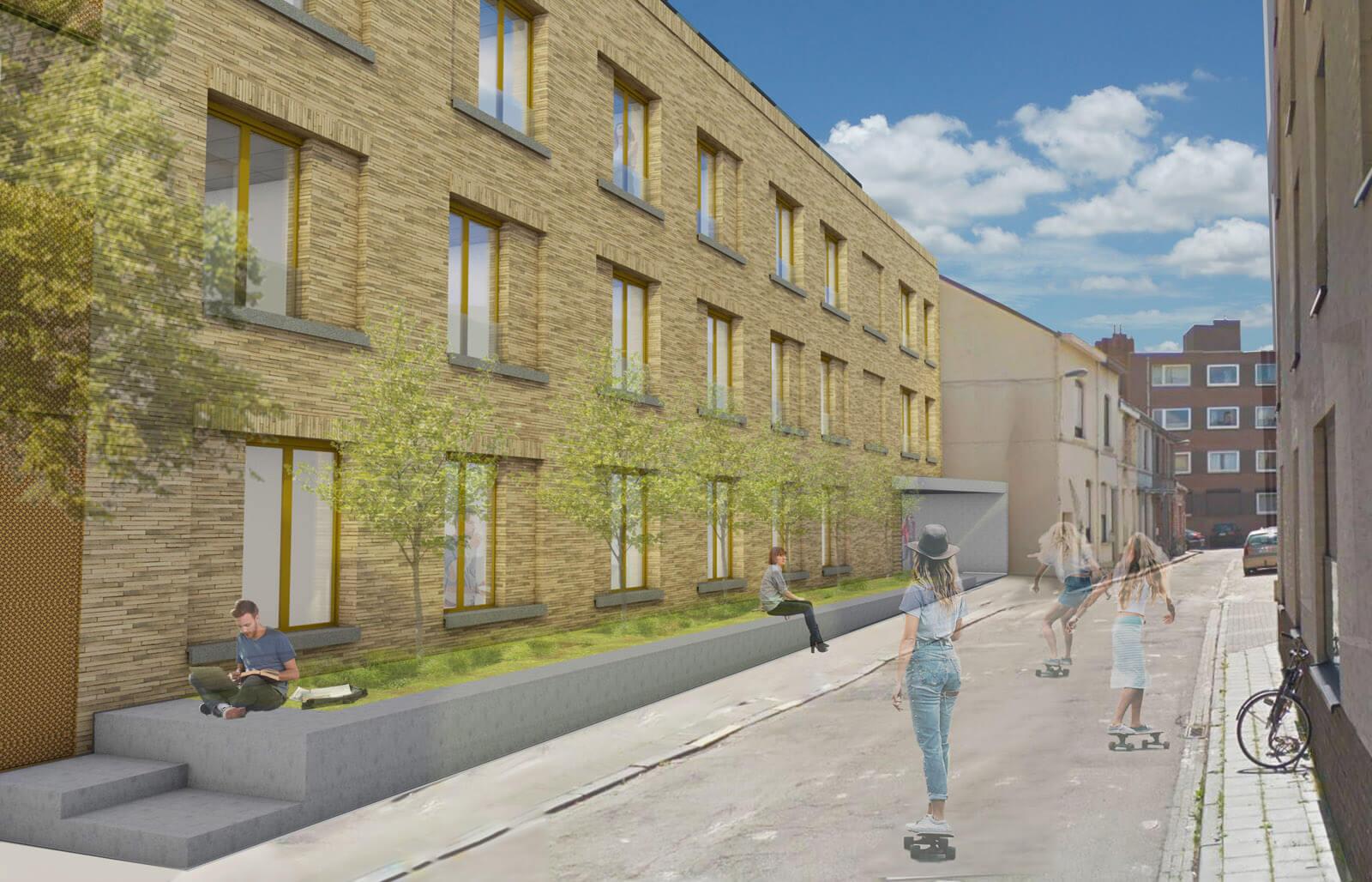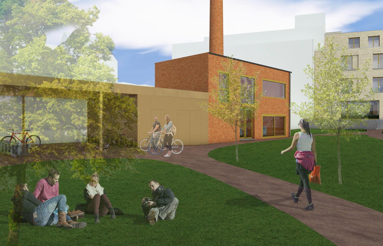 De huidige betonnen vlakte wordt volledig vergroend: auto’s krijgen geen toegang en er worden bomen en grasperkjes aangeplant. De karakteristieke schoorsteen blijft behouden. Het gebouw wordt in ere hersteld en biedt plaats aan de fietsenstalling en een aantal gemeenschappelijke ruimtes midden in de tuin.